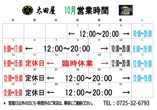 10月の営業時間のお知らせ